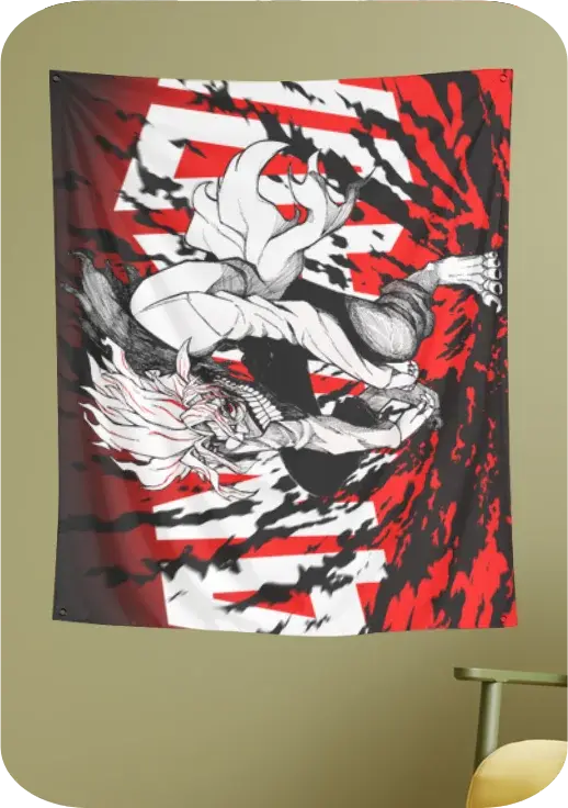 Unleash raw energy on your wall with this explosive black-and-red tapestry, featuring a striking illustration of a fierce demon mid-attack. Inspired by the chaos and fury of anime battle scenes, this design captures the violent motion and powerful aura of a true warrior in combat.